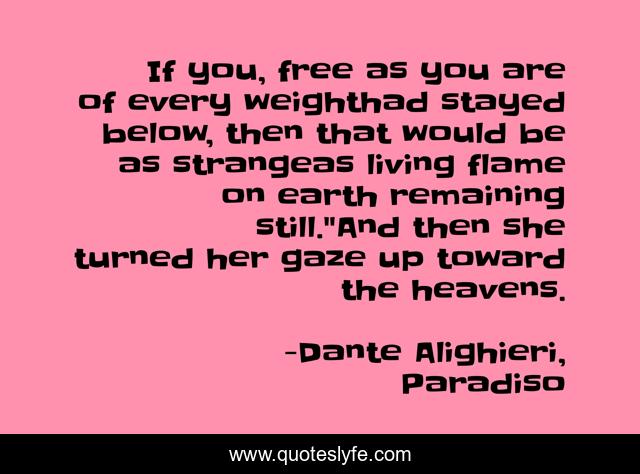 This page presents the quote "If you, free as you are of every weighthad stayed below, then that would be as strangeas living flame on earth remaining still."And then she turned her gaze up toward the heavens.". Author of this quote is Dante Alighieri, Paradiso. This quote is about theosis, grace,.