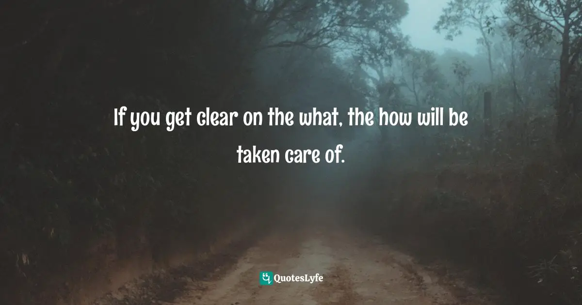 This page presents the quote "If you get clear on the what, the how will be taken care of.". Author of this quote is Jack Canfield, The Success Principles: How to Get from Where You Are to Where You Want to Be. This quote is about confidence, positive, motivational, optimistic, inspirational, self-help, enthusiasm, goal-setting,.