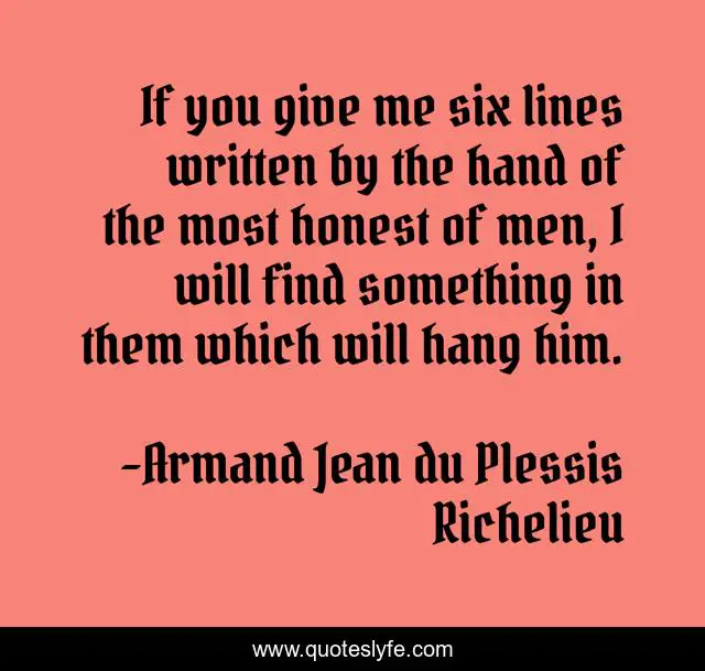 This page presents the quote "If you give me six lines written by the hand of the most honest of men, I will find something in them which will hang him.". Author of this quote is Armand Jean du Plessis Richelieu. This quote is about politics, honesty, man,.