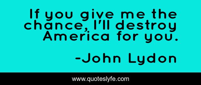 This page presents the quote "If you give me the chance, I'll destroy America for you.". Author of this quote is John Lydon. This quote is about me, america,.