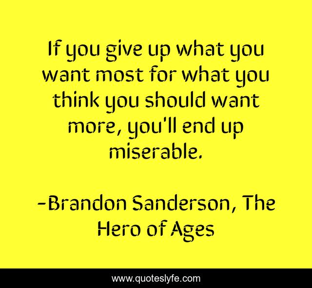 This page presents the quote "If you give up what you want most for what you think you should want more, you'll end up miserable.". Author of this quote is Brandon Sanderson, The Hero of Ages. This quote is about enthusiasm, inspirational, truth,.