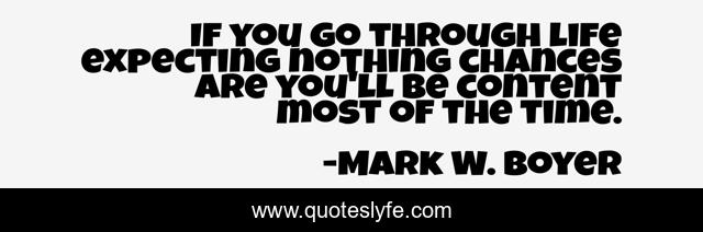 This page presents the quote "If you go through life expecting nothing chances are you'll be content most of the time.". Author of this quote is Mark W. Boyer. This quote is about life, positive, motivational, expectations, optimistic, inspirational, enthusiasm, enlightenment, boyer,.