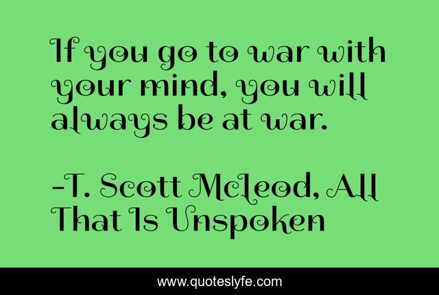 This page presents the quote "If you go to war with your mind, you will always be at war.". Author of this quote is T. Scott McLeod, All That Is Unspoken. This quote is about acceptance, love, freedom, peace, life-s-truths, awakening, the-meaning-of-life, truth, acceptance-of-others,.
