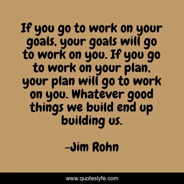 This page presents the quote "If you go to work on your goals, your goals will go to work on you. If you go to work on your plan, your plan will go to work on you. Whatever good things we build end up building us.". Author of this quote is Jim Rohn. This quote is about good, goals, plan,.
