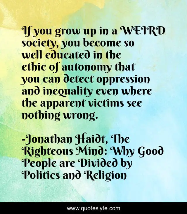 "Jonathan Haidt, The Righteous Mind: Why Good People are Divided by Politics and Religion Quotes." Quoteslyfe.com, 2025. Sat. 06 Dec. 2025. <https://www.quoteslyfe.com/quote/If-you-grow-up-in-a-WEIRD-254125>.