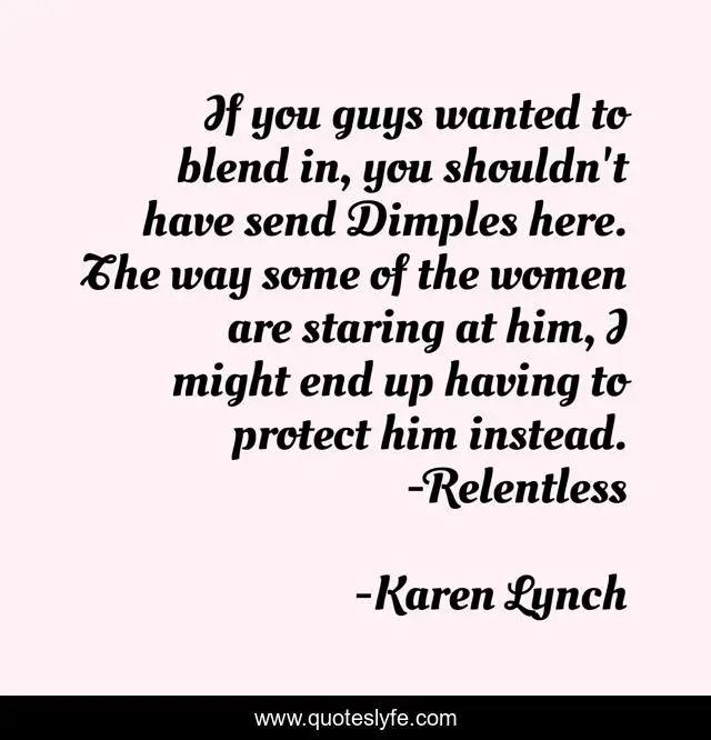 This page presents the quote "If you guys wanted to blend in, you shouldn't have send Dimples here. The way some of the women are staring at him, I might end up having to protect him instead. -Relentless". Author of this quote is Karen Lynch. This quote is about ya, sara, relentless,.