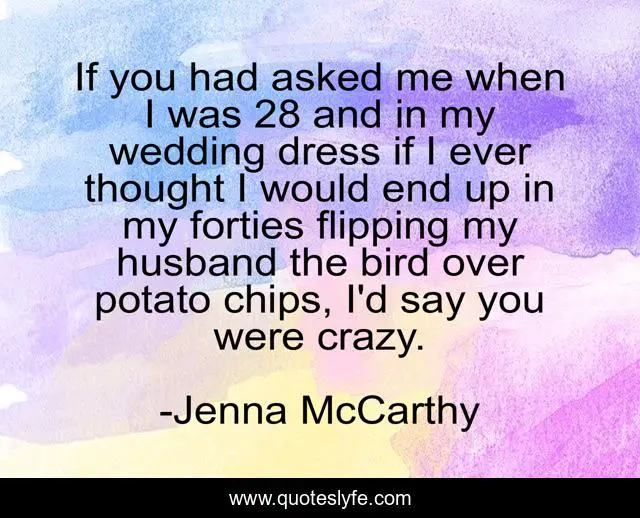 This page presents the quote "If you had asked me when I was 28 and in my wedding dress if I ever thought I would end up in my forties flipping my husband the bird over potato chips, I'd say you were crazy.". Author of this quote is Jenna McCarthy. This quote is about crazy, dress, bird,.