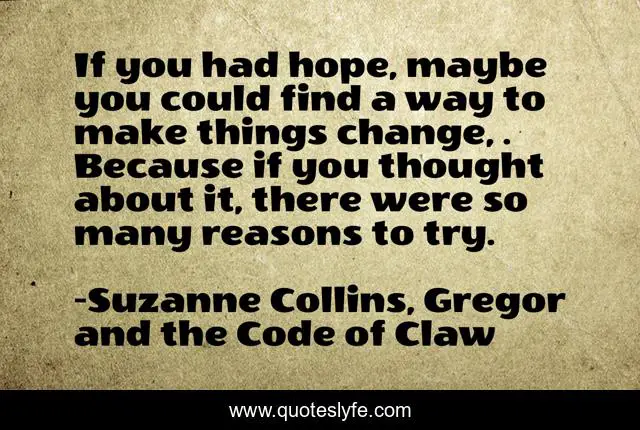 This page presents the quote "If you had hope, maybe you could find a way to make things change, . Because if you thought about it, there were so many reasons to try.". Author of this quote is Suzanne Collins, Gregor and the Code of Claw. This quote is about change, hope, war,.