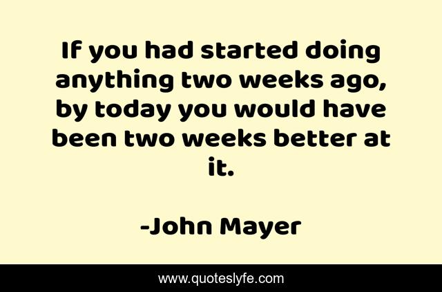 This page presents the quote "If you had started doing anything two weeks ago, by today you would have been two weeks better at it.". Author of this quote is John Mayer. This quote is about dedication, imagination, commitment, inspiration,.