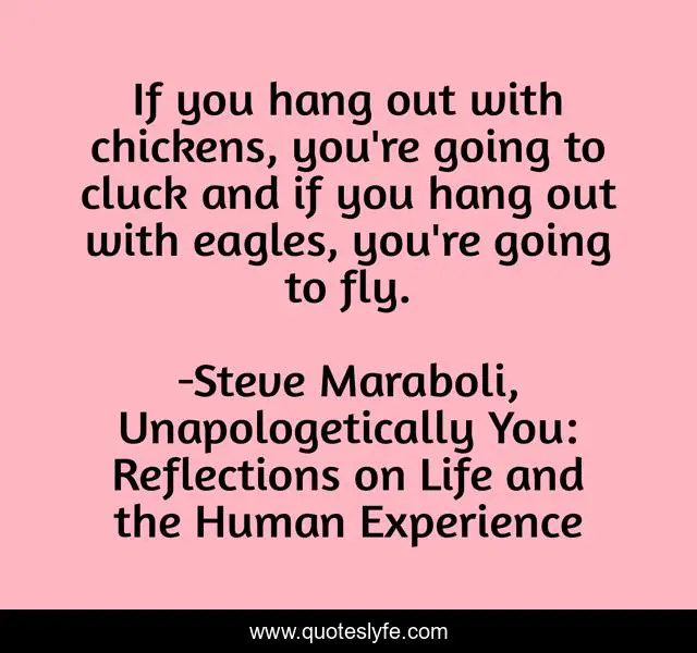 This page presents the quote "If you hang out with chickens, you're going to cluck and if you hang out with eagles, you're going to fly.". Author of this quote is Steve Maraboli, Unapologetically You: Reflections on Life and the Human Experience. This quote is about life, success, positive, motivational, confidence, accountability, responsibility, purpose, inspirational,.