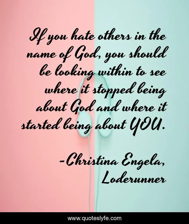 This page presents the quote "If you hate others in the name of God, you should be looking within to see where it stopped being about God and where it started being about YOU.". Author of this quote is Christina Engela, Loderunner. This quote is about god, stopped, hate,.