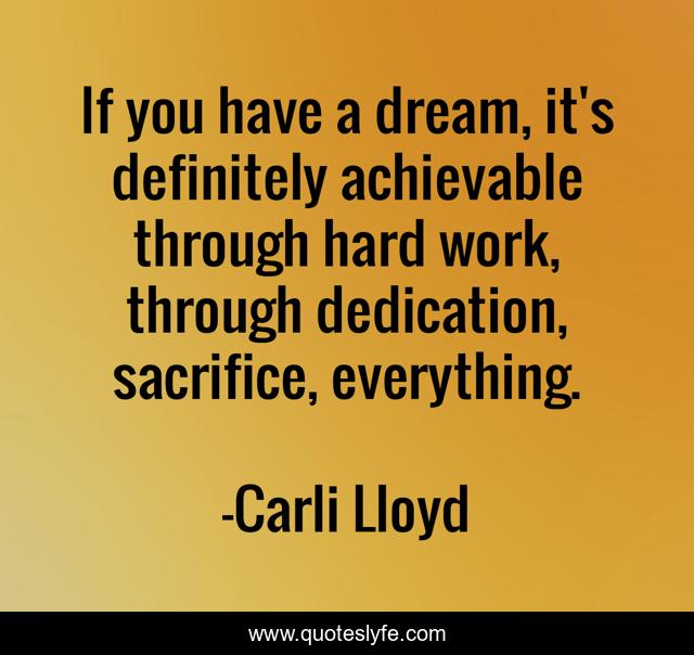 This page presents the quote "If you have a dream, it's definitely achievable through hard work, through dedication, sacrifice, everything.". Author of this quote is Carli Lloyd. This quote is about sacrifice, hard work,.
