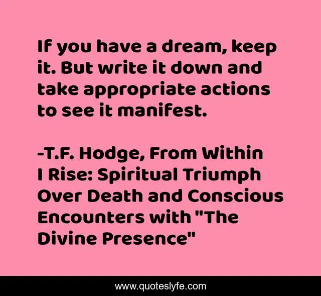 This page presents the quote "If you have a dream, keep it. But write it down and take appropriate actions to see it manifest.". Author of this quote is T.F. Hodge, From Within I Rise: Spiritual Triumph Over Death and Conscious Encounters with "The Divine Presence". This quote is about manifest, quotes, setting-goals, determination, manifestation, action, writing, dreams,.