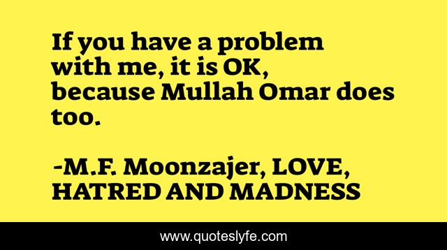 This page presents the quote "If you have a problem with me, it is OK, because Mullah Omar does too.". Author of this quote is M.F. Moonzajer, LOVE, HATRED AND MADNESS. This quote is about afghanistan, funny, joke, taliban, mullah-omar, problem, comedy,.