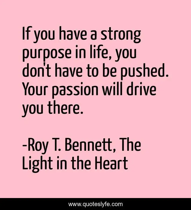 This page presents the quote "If you have a strong purpose in life, you don't have to be pushed. Your passion will drive you there.". Author of this quote is Roy T. Bennett, The Light in the Heart. This quote is about motivation, inspire, optimistic, inspirational-life, life-and-living, living, inspiring, positive, positive-thinking,.