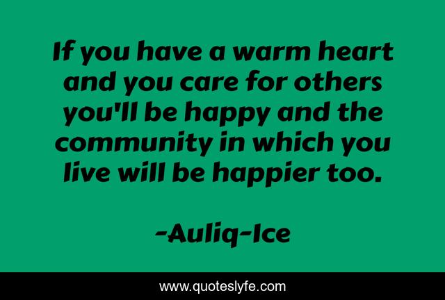This page presents the quote "If you have a warm heart and you care for others you'll be happy and the community in which you live will be happier too.". Author of this quote is Auliq-Ice. This quote is about love, peace, unity, happiness, forgiveness, affection,.