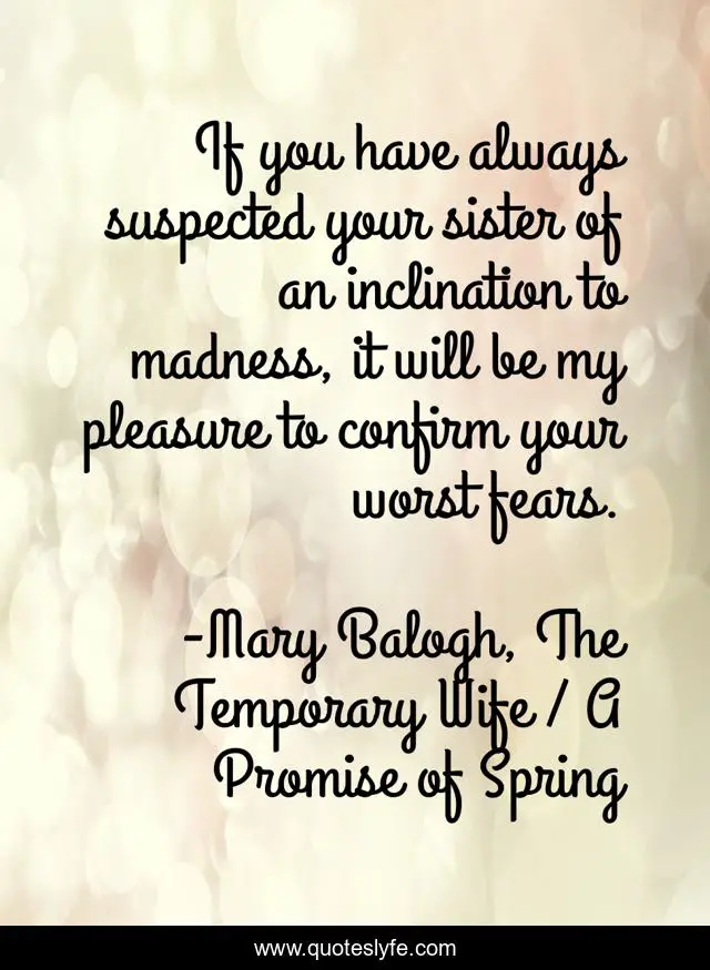 This page presents the quote "If you have always suspected your sister of an inclination to madness, it will be my pleasure to confirm your worst fears.". Author of this quote is Mary Balogh, The Temporary Wife / A Promise of Spring. This quote is about regency, historical-romance,.