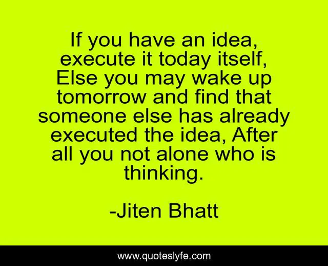 This page presents the quote "If you have an idea, execute it today itself, Else you may wake up tomorrow and find that someone else has already executed the idea, After all you not alone who is thinking.". Author of this quote is Jiten Bhatt. This quote is about positive, confidence, motivational, ideas, optimistic,.