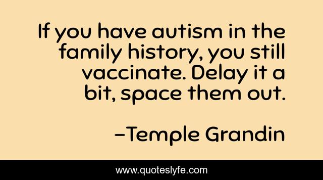 This page presents the quote "If you have autism in the family history, you still vaccinate. Delay it a bit, space them out.". Author of this quote is Temple Grandin. This quote is about family, history,.