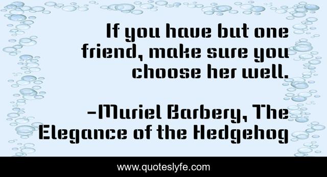 This page presents the quote "If you have but one friend, make sure you choose her well.". Author of this quote is Muriel Barbery, The Elegance of the Hedgehog. .
