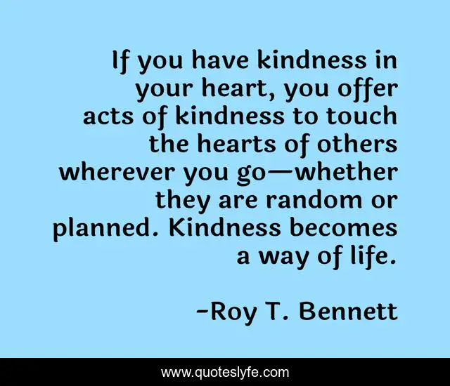 This page presents the quote "If you have kindness in your heart, you offer acts of kindness to touch the hearts of others wherever you go—whether they are random or planned. Kindness becomes a way of life.". Author of this quote is Roy T. Bennett. This quote is about living, inspiring, kindness, inspire, positive, positive-affirmation, life, confidence, optimism,.