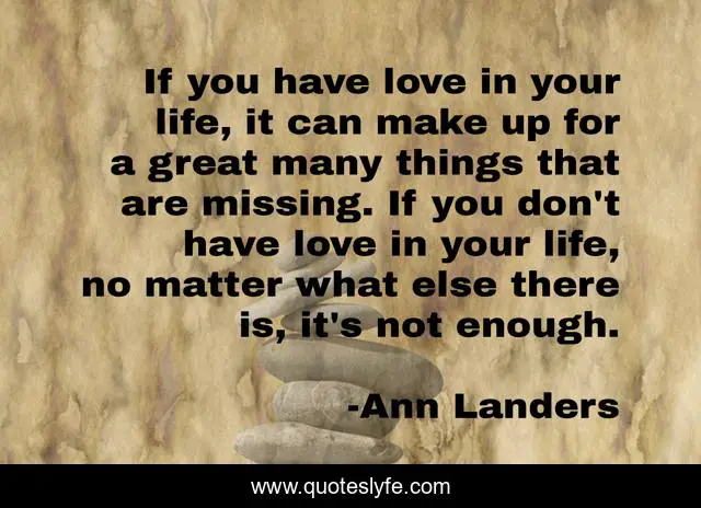 This page presents the quote "If you have love in your life, it can make up for a great many things that are missing. If you don't have love in your life, no matter what else there is, it's not enough.". Author of this quote is Ann Landers. This quote is about life, love, affection,.