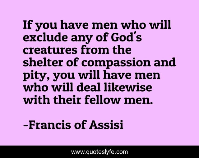 This page presents the quote "If you have men who will exclude any of God's creatures from the shelter of compassion and pity, you will have men who will deal likewise with their fellow men.". Author of this quote is Francis of Assisi. This quote is about compassion, pity, peace, animals,.