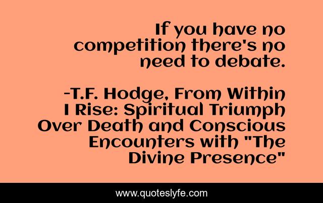 This page presents the quote "If you have no competition there's no need to debate.". Author of this quote is T.F. Hodge, From Within I Rise: Spiritual Triumph Over Death and Conscious Encounters with "The Divine Presence". This quote is about empowerment, secure, self-assurance, confidence, competition, compete, dabate, argue,.