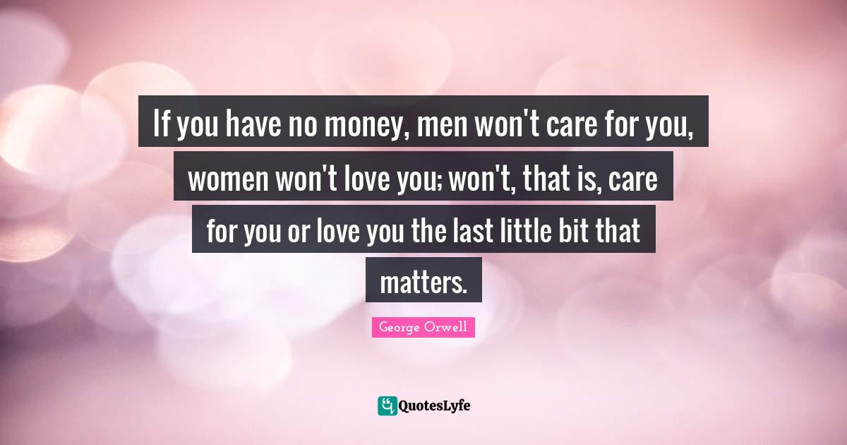 This page presents the quote "If you have no money, men won't care for you, women won't love you; won't, that is, care for you or love you the last little bit that matters.". Author of this quote is George Orwell. This quote is about no money, men, little bit, women, care for you, care, love you,.