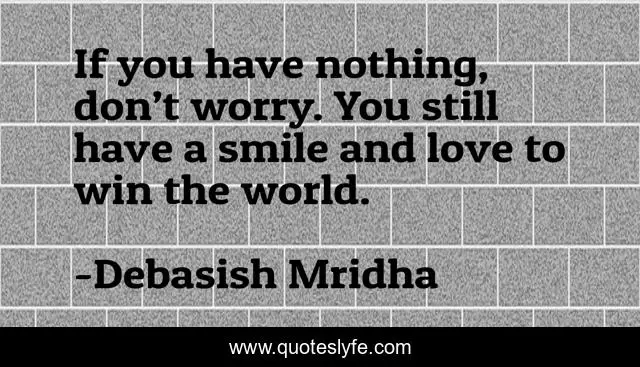 This page presents the quote "If you have nothing, don’t worry. You still have a smile and love to win the world.". Author of this quote is Debasish Mridha. This quote is about don-t-worry, philosophy, debasish-mridha, quotes, love-to-win-the-world, importance-of-a-smile, inspirational, smile, enthusiasm,.