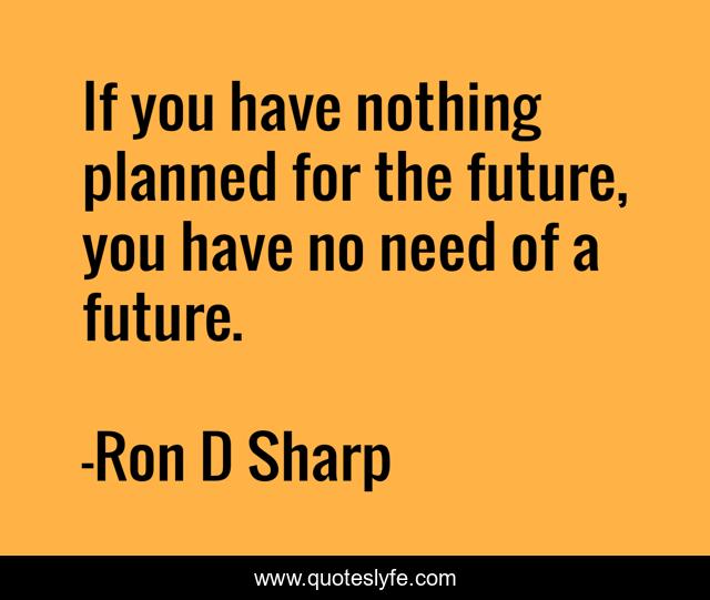 This page presents the quote "If you have nothing planned for the future, you have no need of a future.". Author of this quote is Ron D Sharp. This quote is about future-plans, future, goals,.