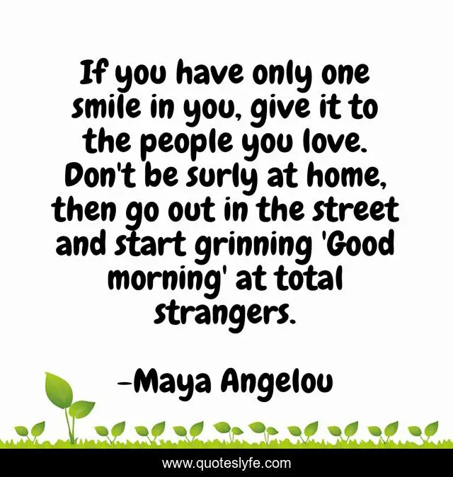 This page presents the quote "If you have only one smile in you, give it to the people you love. Don't be surly at home, then go out in the street and start grinning 'Good morning' at total strangers.". Author of this quote is Maya Angelou. This quote is about smile, happiness,.