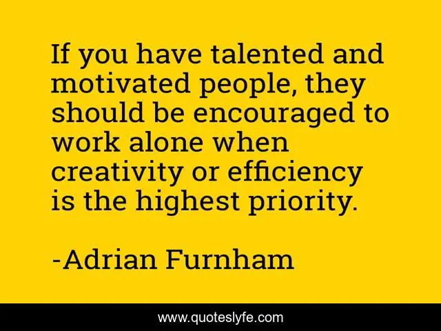 This page presents the quote "If you have talented and motivated people, they should be encouraged to work alone when creativity or efficiency is the highest priority.". Author of this quote is Adrian Furnham. .