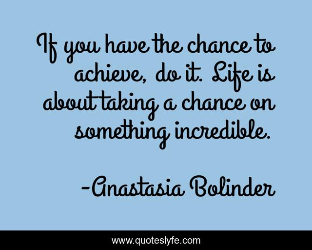 This page presents the quote "If you have the chance to achieve, do it. Life is about taking a chance on something incredible.". Author of this quote is Anastasia Bolinder. This quote is about life, writer, inspire, incredible, achieve-your-dreams, achive, write, inspirational, enthusiasm,.