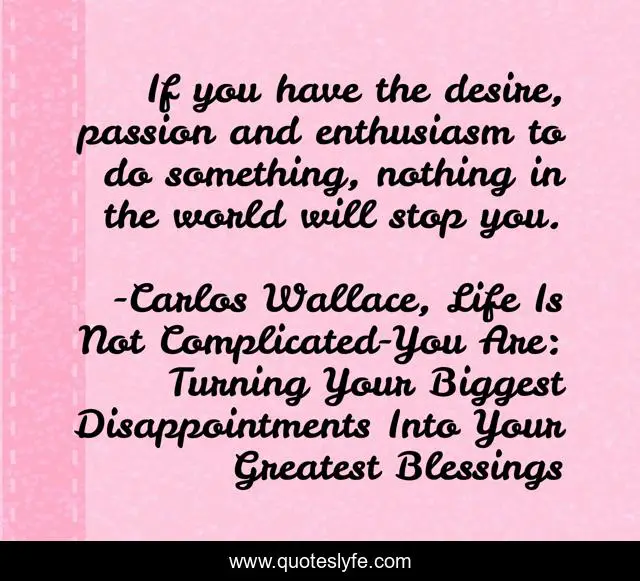 This page presents the quote "If you have the desire, passion and enthusiasm to do something, nothing in the world will stop you.". Author of this quote is Carlos Wallace, Life Is Not Complicated-You Are: Turning Your Biggest Disappointments Into Your Greatest Blessings. This quote is about passion, desires,.