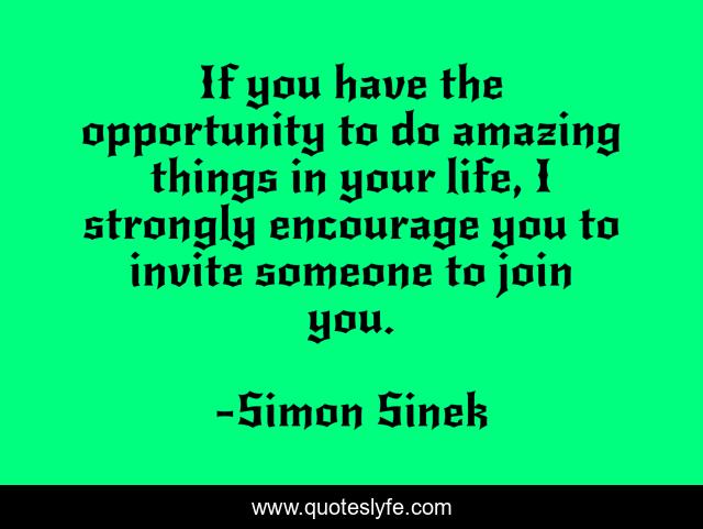 This page presents the quote "If you have the opportunity to do amazing things in your life, I strongly encourage you to invite someone to join you.". Author of this quote is Simon Sinek. This quote is about life, opportunity,.