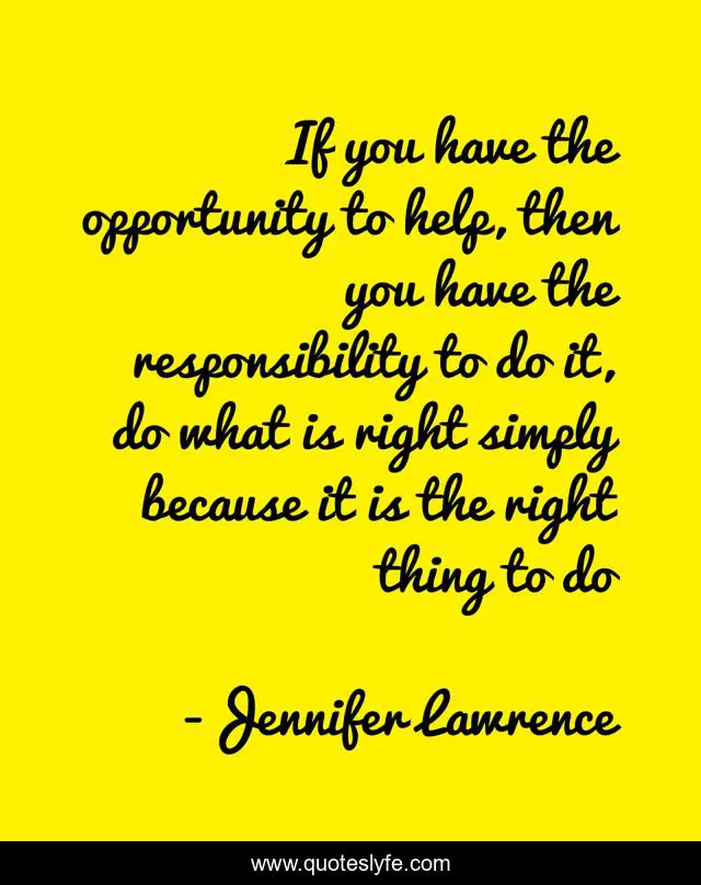 This page presents the quote "If you have the opportunity to help, then you have the responsibility to do it, do what is right simply because it is the right thing to do". Author of this quote is Jennifer Lawrence. This quote is about responsibility, help,.