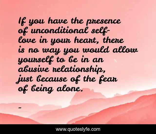 This page presents the quote "If you have the presence of unconditional self-love in your heart, there is no way you would allow yourself to be in an abusive relationship, just because of the fear of being alone.". Author of this quote is . This quote is about the-fear-of-being-alone, being-in-an-abusive-relationship, edmond-mbiaka, loving-yourself-unconditionally, unconditional-self-love, don-t-let-others-abuse-you, partner, an-abusive-relationship,.