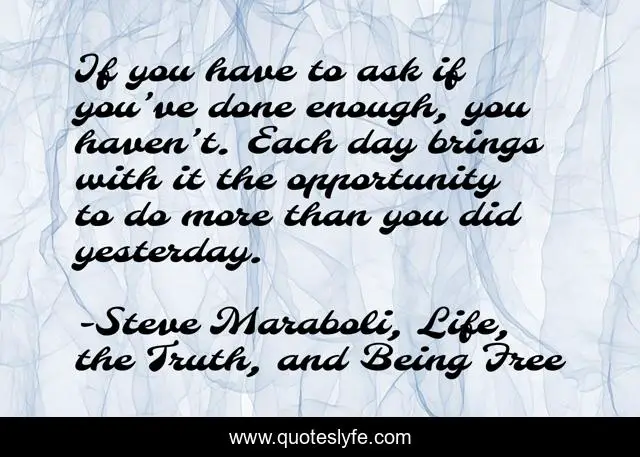 This page presents the quote "If you have to ask if you’ve done enough, you haven’t. Each day brings with it the opportunity to do more than you did yesterday.". Author of this quote is Steve Maraboli, Life, the Truth, and Being Free. This quote is about confidence, success, positive, motivational, optimistic, action, opportunity,.