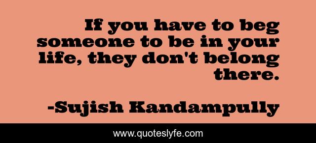 This page presents the quote "If you have to beg someone to be in your life, they don't belong there.". Author of this quote is Sujish Kandampully. This quote is about love, affection, love-hurts,.