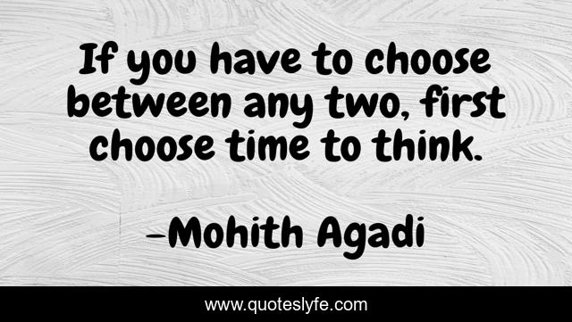 This page presents the quote "If you have to choose between any two, first choose time to think.". Author of this quote is Mohith Agadi. This quote is about quote, decision, quotes-by-mohith, quotes, mohith, choose, mohith-agadi, think,.
