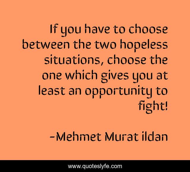 This page presents the quote "If you have to choose between the two hopeless situations, choose the one which gives you at least an opportunity to fight!". Author of this quote is Mehmet Murat ildan. .