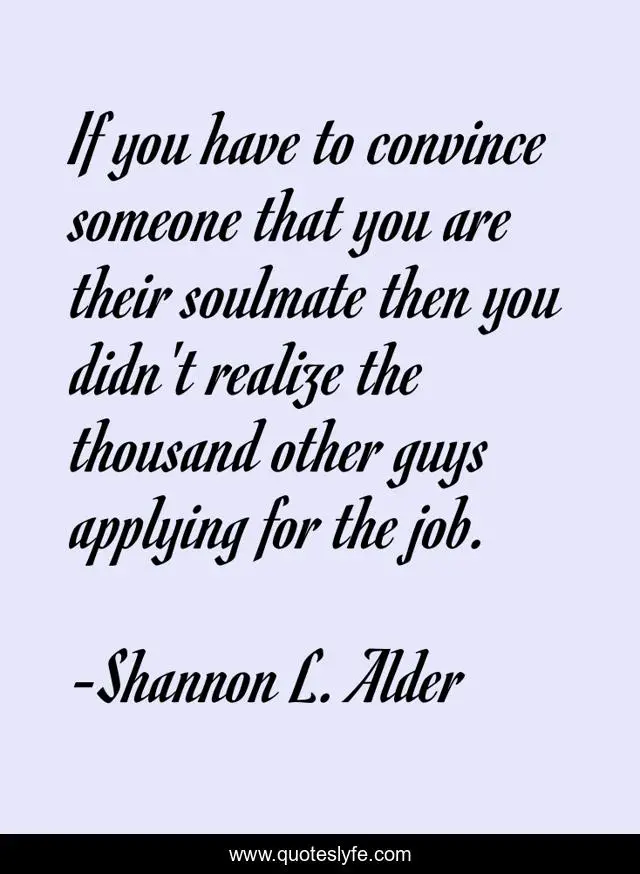 This page presents the quote "If you have to convince someone that you are their soulmate then you didn't realize the thousand other guys applying for the job.". Author of this quote is Shannon L. Alder. This quote is about beautiful, confidence, self-respect, empowering-women, flirting, soulmates, self-love, courting, stayingpositiveu-com,.