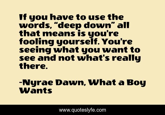 This page presents the quote "If you have to use the words, “deep down” all that means is you're fooling yourself. You're seeing what you want to see and not what's really there.". Author of this quote is Nyrae Dawn, What a Boy Wants. This quote is about deep, fooling-yourself, words,.