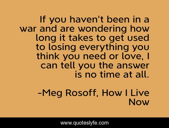This page presents the quote "If you haven't been in a war and are wondering how long it takes to get used to losing everything you think you need or love, I can tell you the answer is no time at all.". Author of this quote is Meg Rosoff, How I Live Now. This quote is about love, war, affection,.