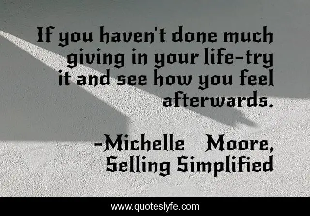 This page presents the quote "If you haven't done much giving in your life-try it and see how you feel afterwards.". Author of this quote is Michelle Moore, Selling Simplified. This quote is about giving, selling, selling-skills, helping-others, giving-help,.