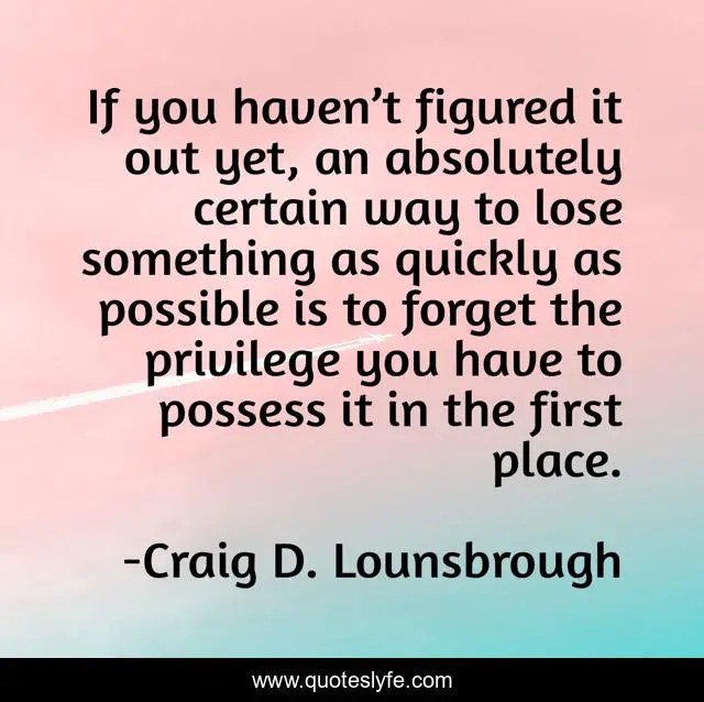 This page presents the quote "If you haven’t figured it out yet, an absolutely certain way to lose something as quickly as possible is to forget the privilege you have to possess it in the first place.". Author of this quote is Craig D. Lounsbrough. This quote is about owed, forget, laziness, discover, discovered, forgot, selfishness, selfish, entitlement,.