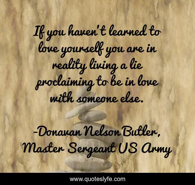 This page presents the quote "If you haven't learned to love yourself you are in reality living a lie proclaiming to be in love with someone else.". Author of this quote is Donavan Nelson Butler, Master Sergeant US Army. This quote is about self-awareness, self-care, self-esteem,.