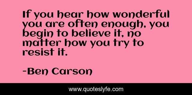 This page presents the quote "If you hear how wonderful you are often enough, you begin to believe it, no matter how you try to resist it.". Author of this quote is Ben Carson. This quote is about enthusiasm, wonderful, inspirational,.