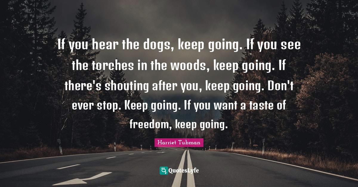 This page presents the quote "If you hear the dogs, keep going. If you see the torches in the woods, keep going. If there's shouting after you, keep going. Don't ever stop. Keep going. If you want a taste of freedom, keep going.". Author of this quote is Harriet Tubman. This quote is about torches, keep going, taste, freedom, dog, want, shouting, woods,.